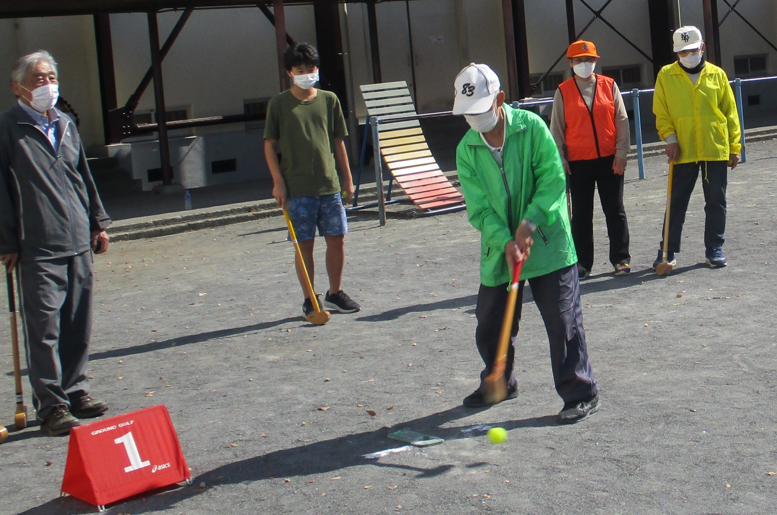 開会式の後、「シニア・一般の部」「子どもの部」「町会対抗」の3部に分かれて、グラウンドゴルフを行いました。
