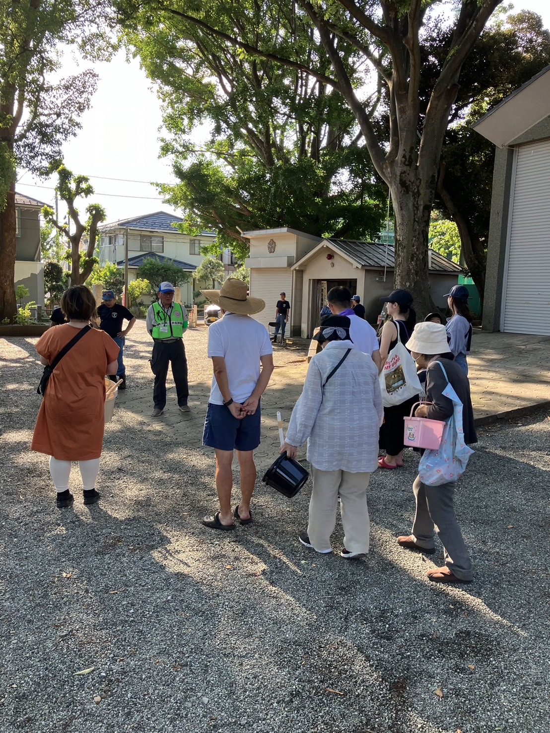 打ち水開始時刻は16:00でしたが、外はものすごい暑さ。こ熱中症予防対策を施した地域の皆さんは、杉山神社に集合し、祐天寺地蔵から宝秀寺に続く”六角橋古道”周辺にある「災害用井戸協力の家」を回り水打ちを行ないました。