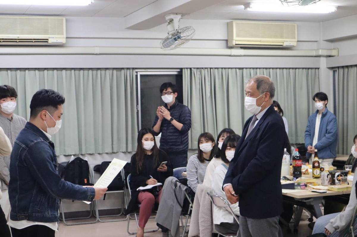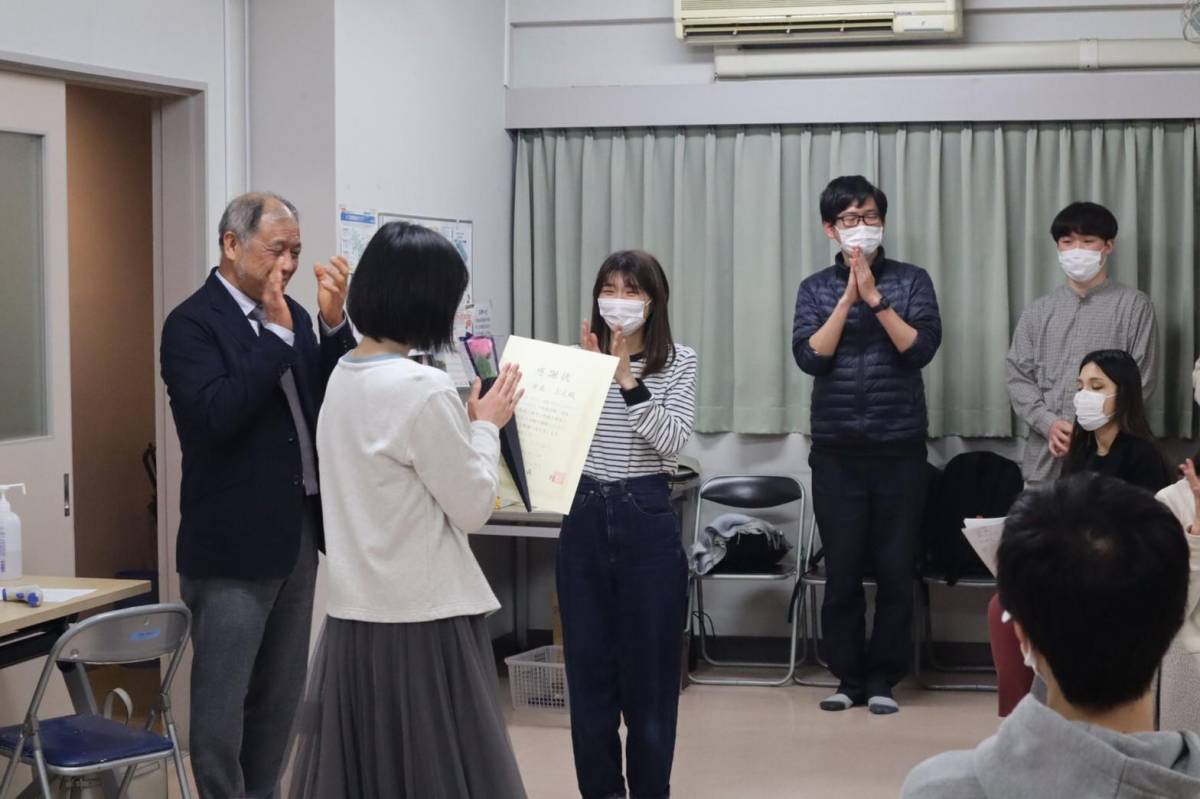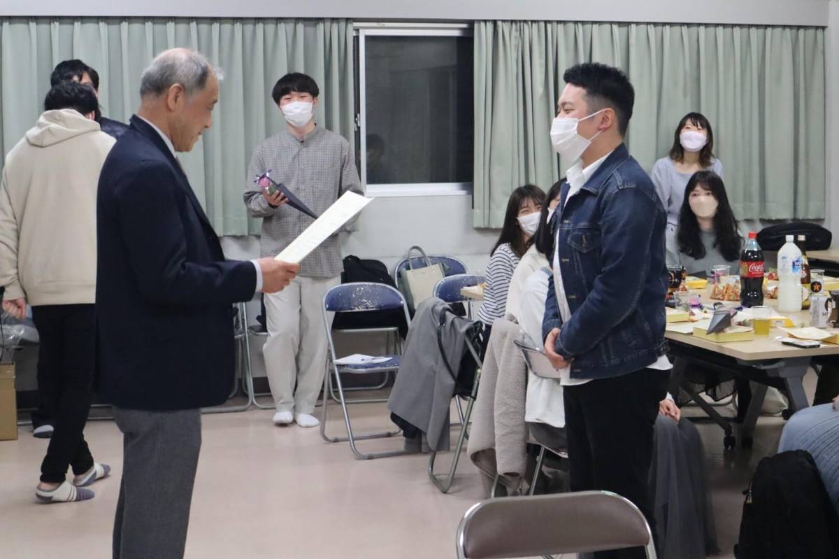門出式では、森勤・六角橋自治連合会会長から門出に当たっての卒業証書を学生一人ひとりに手渡されました。