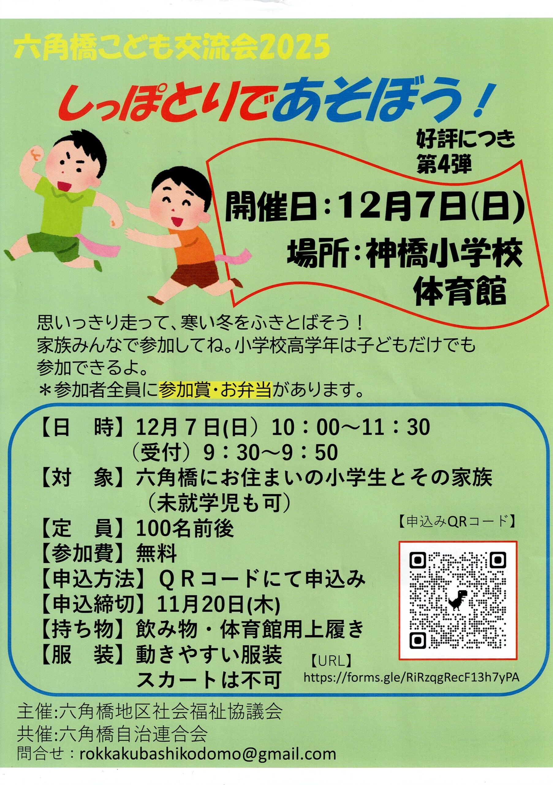 六角橋子ども交流会2025 「しっぽとりで あそぼう」!」の開催のお知らせ 2025.11.09 Tweet Share Hatena Pocket RSS feedly Pin it 六角橋こども交流会2025 例年好評をいただいている「しっぽとり」で今年も楽しくあそびましょう!(主催:六角橋地区社会福祉協議会 共催:六角橋自治連合会) 申込は添付のちらしをご覧ください。 Tweet Share Hatena Pocket RSS feedly Pin it